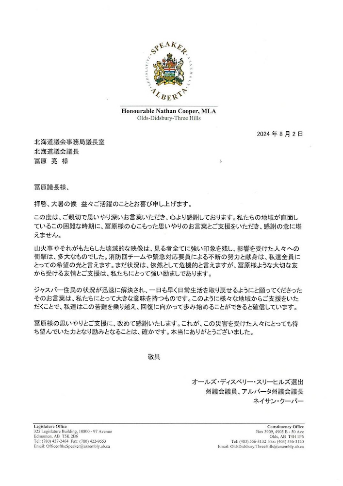 アルバータ州と北海道そして州議会と道議会は友好関係にあり、7月下旬にアルバータ州のリゾート地でもあるジャスパー国立公園を含むエリアが山火事に見舞われ、その際に山火事の終息と平穏な日常が1日も早く取り戻されるように願い、道議会議長としてお見舞いの書簡をアルバータ州議会に送らせていただいておりました。